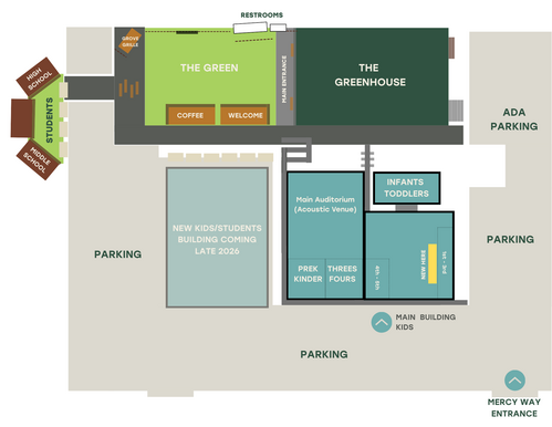 Use the campus map to find the best parking, entrances, kids check-in, and worship venue locations.